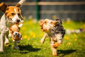 Cute Yorkshire Terrier dog running with beagle dog on gras on sunny day.